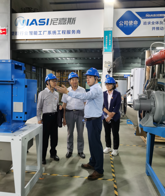 東莞市尼嘉斯塑膠機(jī)械唐亞青總經(jīng)理等公司領(lǐng)導(dǎo)熱情接待了王主任一行,高興地向王主任一行介紹了企業(yè)創(chuàng)新發(fā)展情況,觀看了智能工廠展示廳,唐總親自講解,引導(dǎo)大家參觀生產(chǎn)現(xiàn)場(chǎng)。
