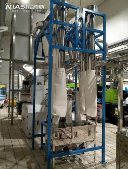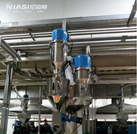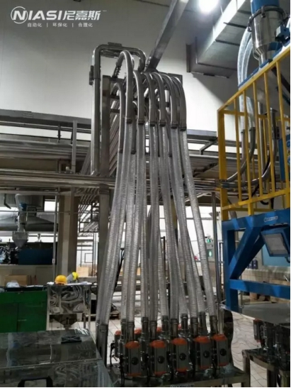 此次工程是一家奶制品公司,對于食品安全尼嘉斯一向高標(biāo)準(zhǔn)嚴(yán)格要求,對材質(zhì)的要求非常嚴(yán)格。結(jié)合客戶要求:共3種原料,原料集中獨(dú)添加色母,并采用自動加料;共規(guī)劃12臺成型機(jī),總用料量840KG/H,最遠(yuǎn)輸送距離50米;所有與原料有接觸配件均采用SUS304,配管方式為一機(jī)一管。