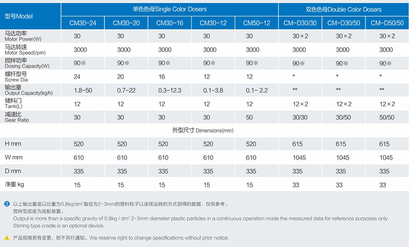 適用于塑料成型生產(chǎn)中的新、次料,色母或添加劑等的自動比例計量喂料。該系列機(jī)型采用精密直流無刷式馬達(dá)。根據(jù)預(yù)先設(shè)定的添加比例和參數(shù),由全數(shù)字式微電腦控制系統(tǒng)將設(shè)定的各項條件自動轉(zhuǎn)換成轉(zhuǎn)速,通過聯(lián)軸器驅(qū)動不銹鋼304精密計量螺桿,向注塑機(jī)或擠出(壓延)的膠筒內(nèi)吐出需要添加的物料。另有雙色、三色四色色母機(jī),根據(jù)用戶需求搭配,滿足不同場合、不同領(lǐng)域的使用。