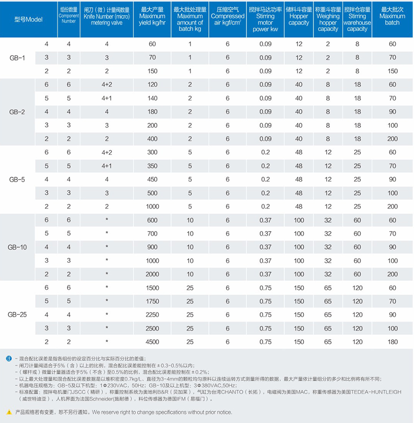 主要用于處理從2種到6種原料的定量稱重計(jì)量和攪拌,包括新料、次料、色母和多種添加劑等進(jìn)行稱重計(jì)量和均勻攪拌混合。計(jì)量能力從5kgs/hr到100kgs/hr。該系列產(chǎn)品采用高精度重量感測(cè)器使批次的混合配比誤差(視設(shè)定配比比例大小而定)能控制在±0.5%。型號(hào)齊全,可滿足多種精度等級(jí)的混合要求。